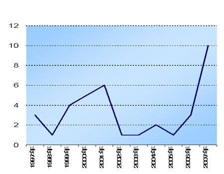 楼定波还对中国近年钢材反倾销案件进行了回顾,并给出了2006-2008年我国钢材贸易摩擦情况一览表: